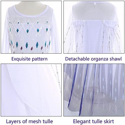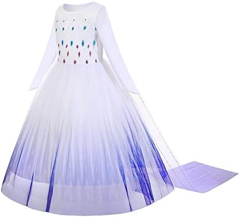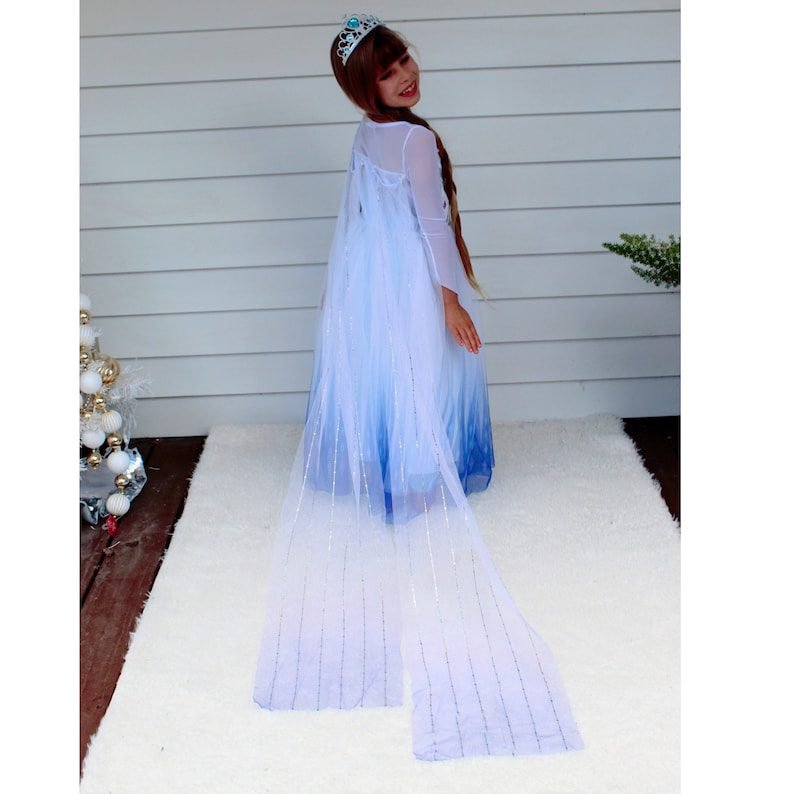 Ilgas, iki pat grindų krintantis sijonas ir dailus šleifas iš dviejų prisegamų juostų suteikia pasakiško lengvumo. Suknelė siūta iš itin minkšto tiulio, todėl vilkėdama ją kiekviena mergaitė pasijus tikra šalčių karalystės princese.