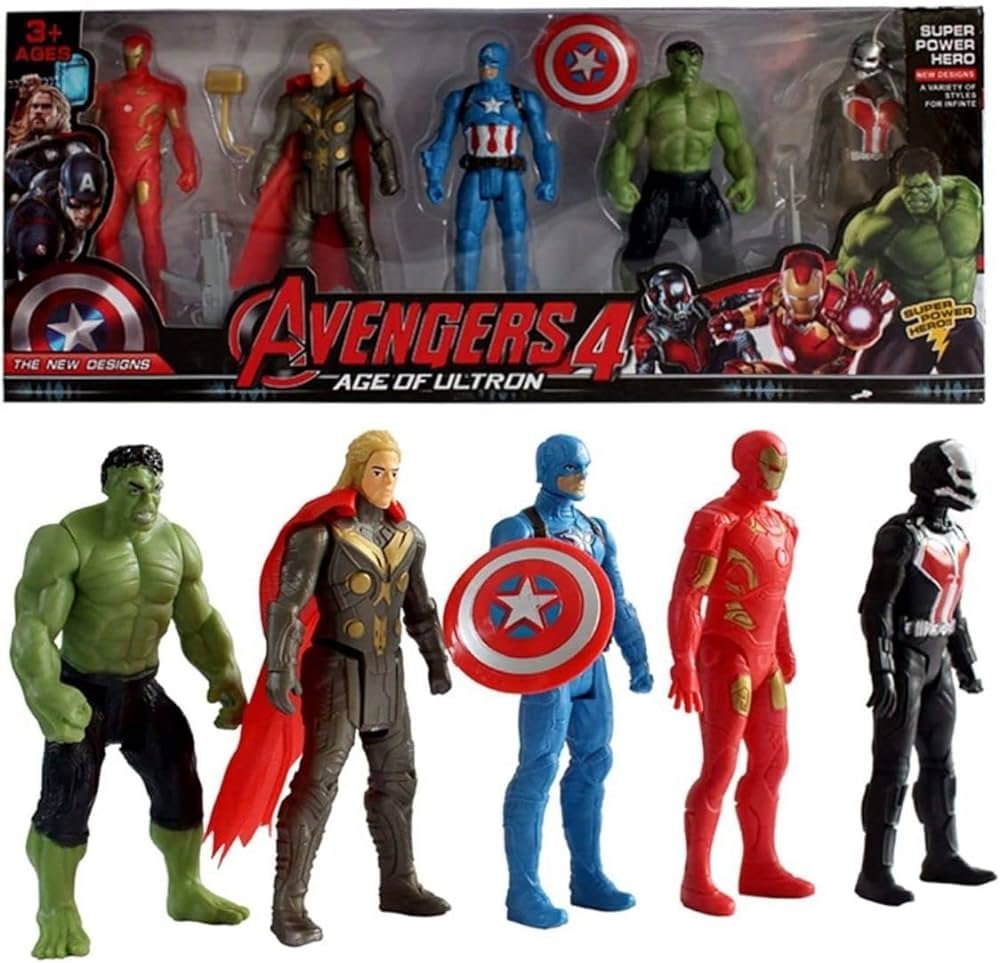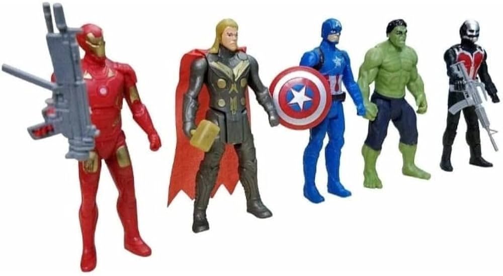 Iron, Kapitonas Amerika, Skruzdėliukas, Halkas ir Toras. Galima judinti rankas, kojas. Rinkinyje yra aksesuarai ginklai, kurie įsistato veikėjams į rankas.