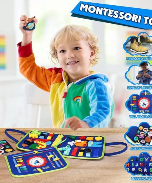 Montessori užimtumo knyga lavina smulkiąją motoriką, loginį mąstymą, dėmesio sutelkimą. Jos viduje yra puzzlė, užtrauktukai, įvairios sagtelės, sraigteliai, kišenėlės, kurias liečiant, spaudinėjant, lavinasi mažylių smulkioji motorika. Knygoje yra laikrodukas, batukas su raišteliais, sagutės. Visa tai padės vaikui ne tik pažinti, bet pritaikyti ir kasdienybėje: rengiantis, prausiantis, aunantis batukus. Knygelėje rasite ir žaismingai iliustruotą abėcėlę, svaitės dienas ir dar daugiau.
