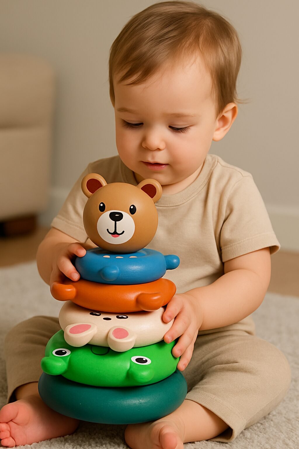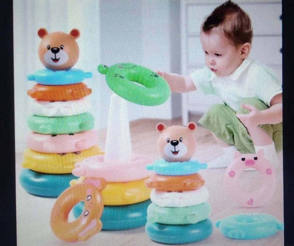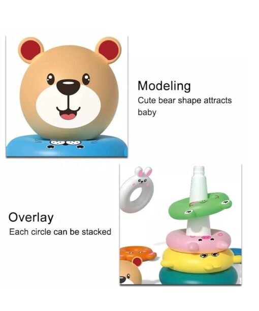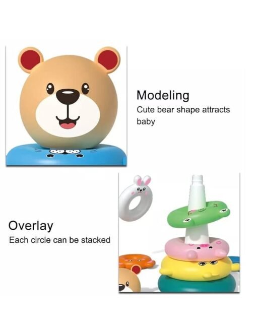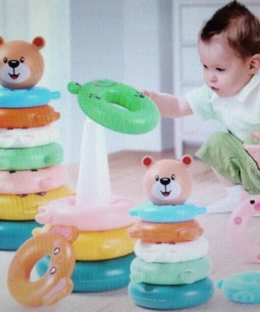 - Dėliojamų žiedų žaislas – tai patrauklus edukacinis žaislas, padedantis kūdikiui atpažinti skirtingas spalvas ir dydžius, linksmai juos dėliojant tinkama tvarka.