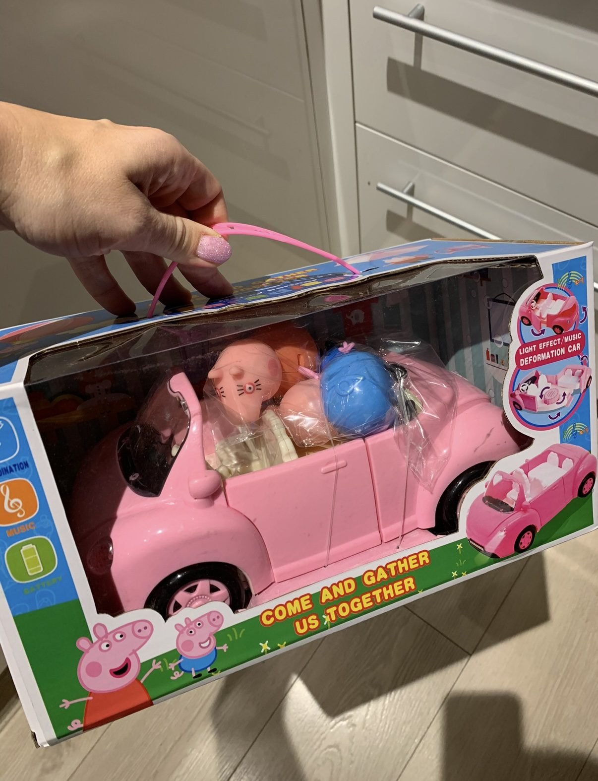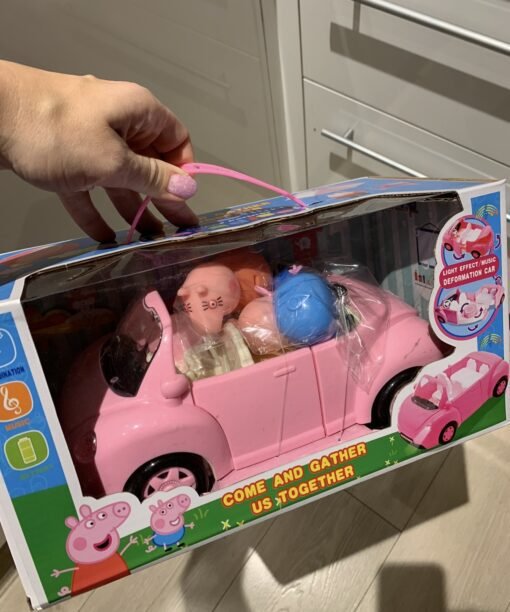 Sveikas atvykęs į kiaulytės Pepos pasaulį! Kartu su Pepa leiskis į smagią kelionę raudonu automobiliu, kuris yra labai panašus, kaip animaciniame filmuke. Šiuo automobiliu keliauja kiaulytė Pepa su savo mama, tėčiu ir broliu Džordžu. Automobilis turi besisukančius ratus, ir atsidarančią bagažinę, o paspaudus mygtuką, pasigirsta smagi muzika.